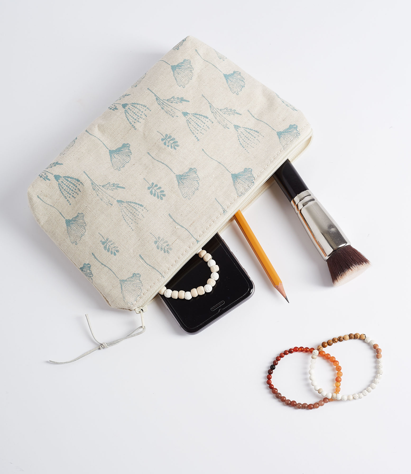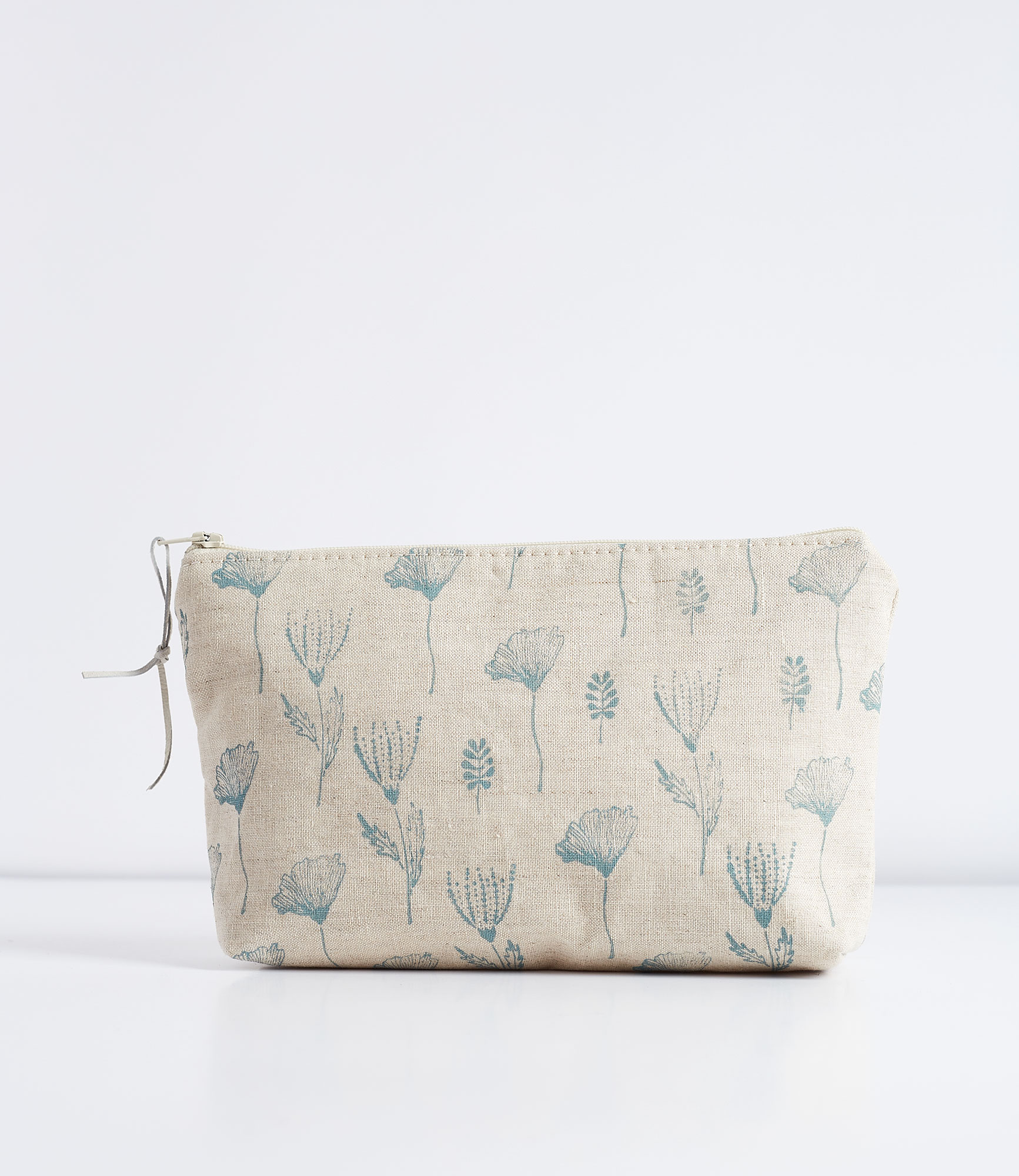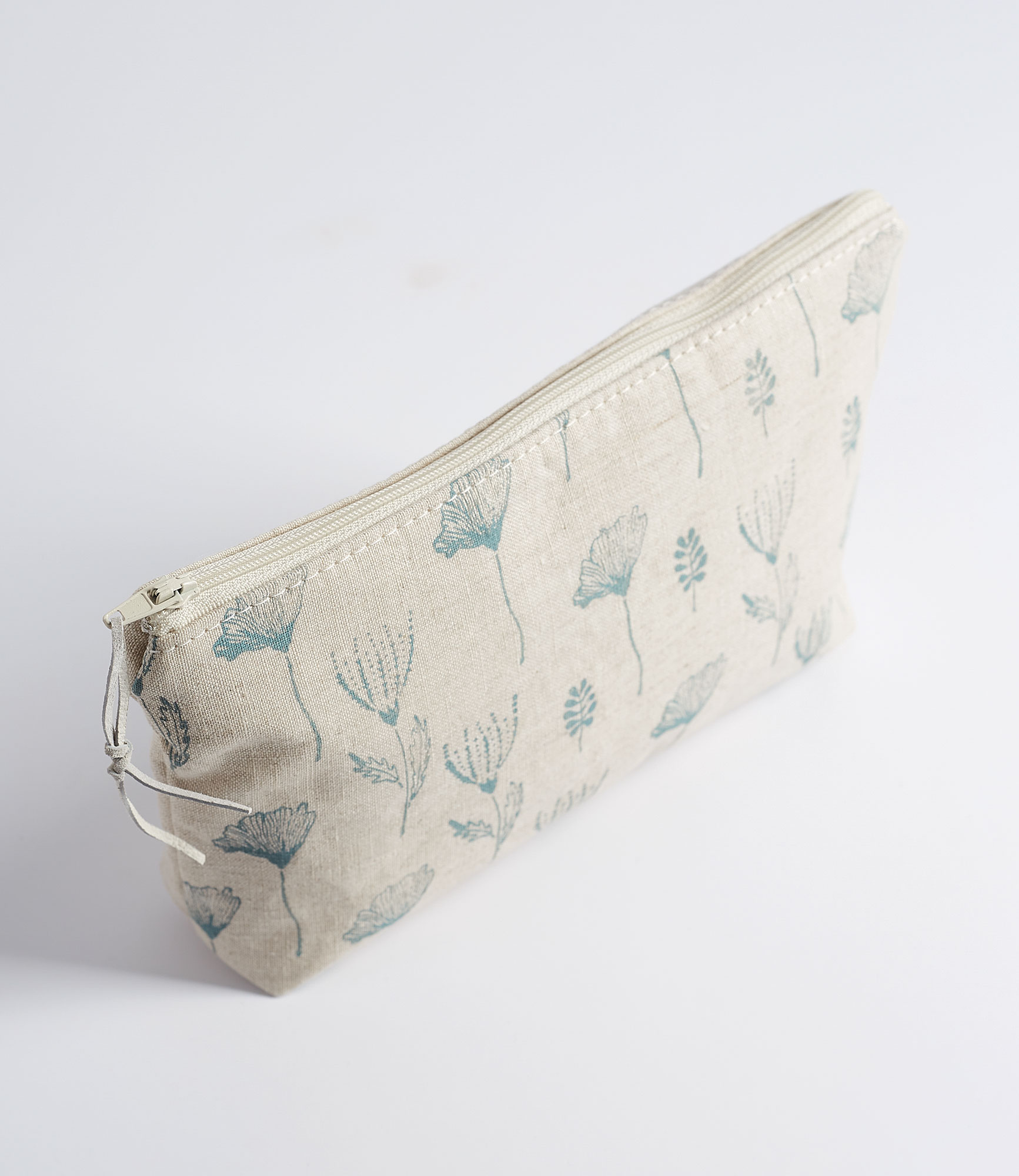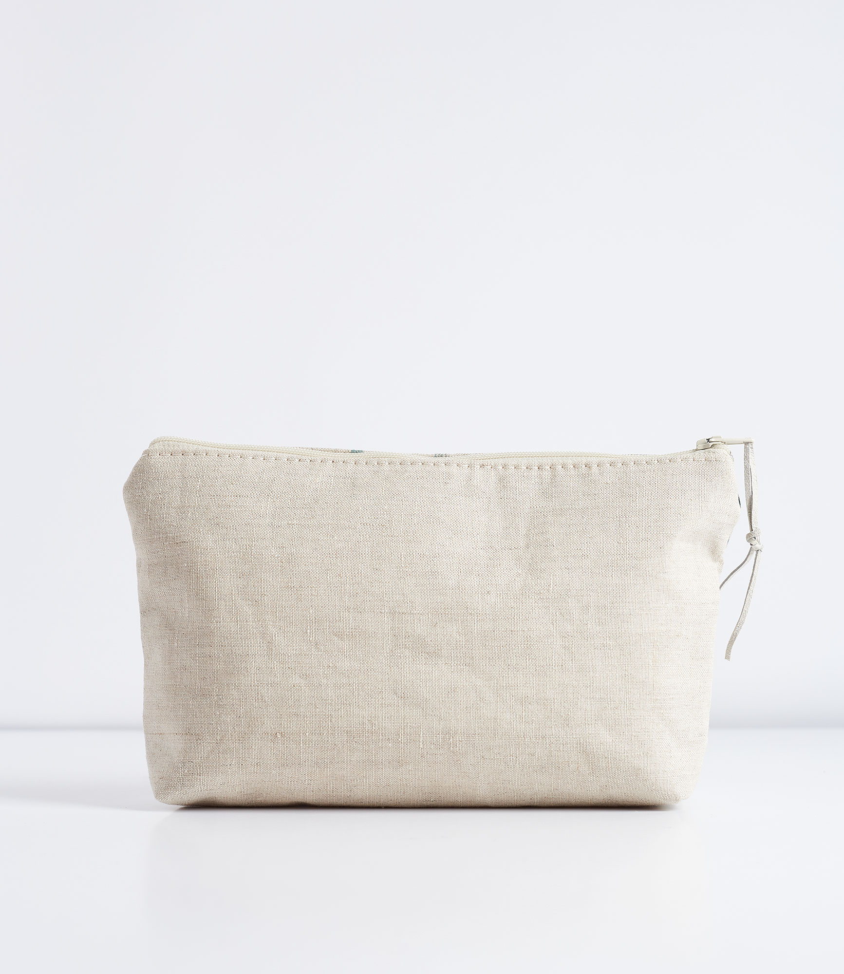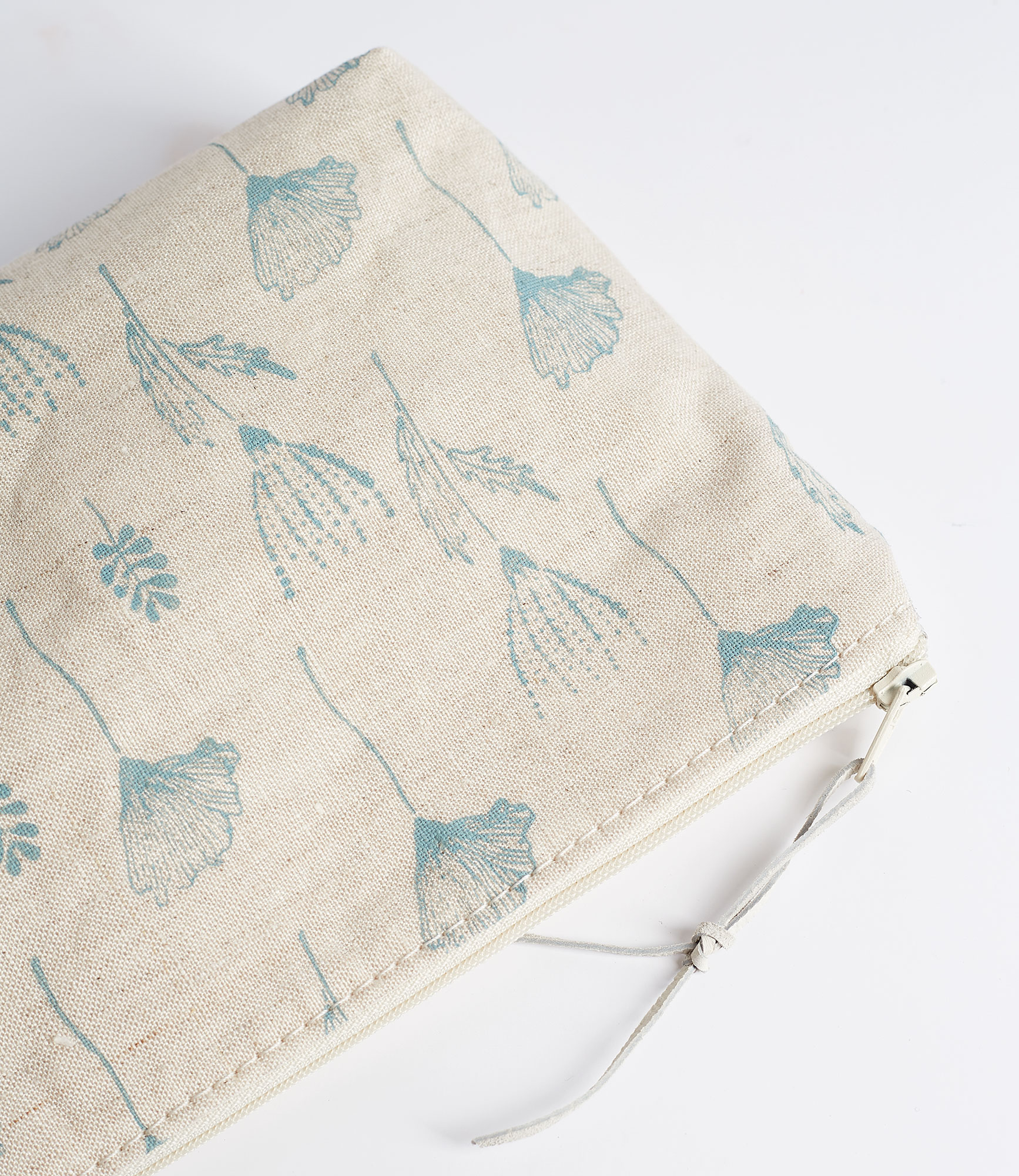 Pouzdro z lněného plátna v přírodním minimalistickém duchu opatřené autorským ručním tiskem. Společník, který se postará o větší pořádek uvnitř vaší kabely a pohlídá nejrůznější nezbytnosti – kosmetiku, brýle, tužky…
